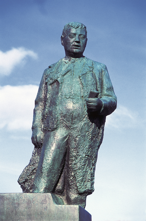 Við suðvesturhorn leikvallar er snýr að Hringbraut Um svipað leyti og Sigurjón Ólafsson vann að minnismerki sr. Friðriks Friðrikssonar við Lækjargötu tók hann að sér að gera standmynd af Héðni Valdimarssyni (1892–1948), alþingismanni og formanni Verkamannafélagsins Dagsbrúnar. Standmyndin var gerð fyrir Byggingarfélag alþýðu og er enn í eigu húsfélags alþýðu, en á sínum tíma var Héðinn einn helsti forystumaður byggingarsamtaka verkamanna. Haustið 1953 var afsteypa af styttunni, sem gerð var hjá málmsteypu Lauritz Rasmussen í Kaupmannahöfn, komin til landsins og þá sótti Byggingarfélag alþýðu um að fá að setja hana upp í nánd við verkamannabústaðina við Hringbraut. Styttan var sett upp í október 1955 en Sigurjón var þá búsettur í Danmörku. Björn Th. Björnsson segir í listasögu sinni að það hafi verið ásetningur Sigurjóns að fanga ekki aðeins „líking“ Héðins, heldur „engu síður hið gustmikla fas“ hins öfluga stjórnmálaskörungs og verkalýðsfrömuðar. Um leið vildi hann myndgera hugmyndina um leiðtoga sem ávallt er fastur fyrir. Að sögn Björns Th. Björnssonar sýnir Sigurjón Héðinn „í hita baráttu en köldum næðingi útifundar. Föt hans eru laus, vindurinn sveiflar til frakkalafi hans; annarri hendinni heldur hann niður með síðunni, en í henni hefur hann minnisblað. (Björn Th. Björnsson: Íslenzk myndlist á 19. og 20. öld II, bls. 200).
